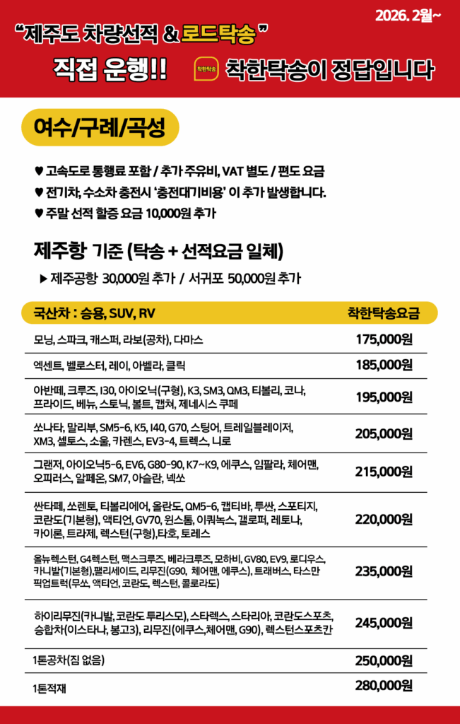 저희 착한은 전국 기준으로도 합리적인 제주도탁송 비용을 유지하려 노력하고 있습니다.