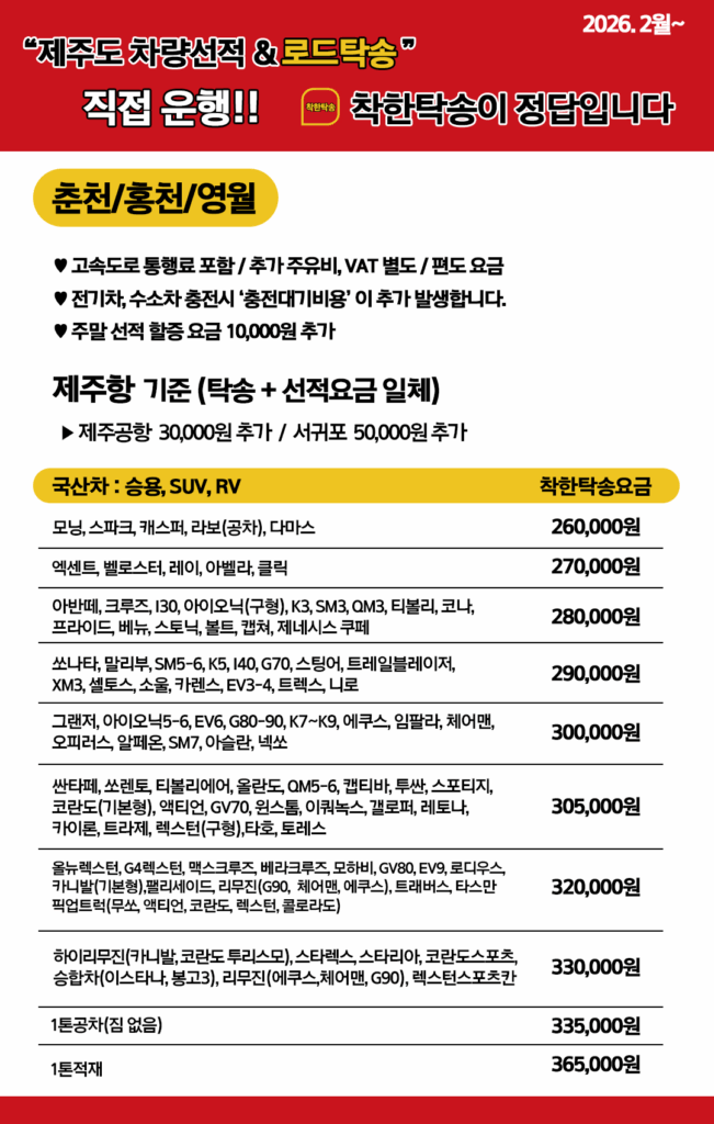 춘천, 홍천, 영월 지역에서 제주도로 차량을 탁송하고자 할 때, 착한탁송은 가장 합리적인 가격과 안전한 서비스를 제공합니다.